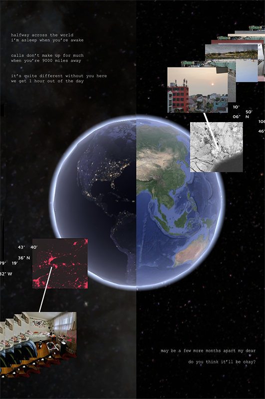 The idea for my poster came from my experience at the beginning of the pandemic. It focusses around the concepts of distance, isolation, anxiety, and uncertainty. Before covid broke out, my partner was travelling to Vietnam. He got stuck there for a while and communication was difficult with poor connection and time difference.