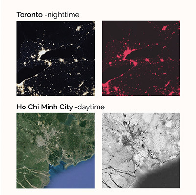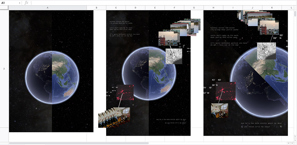 Finally, I compiled all of my elements; Google Earth, city screenshots, personal surrounding photos, location coordinates, and my poem; onto Google Slides to arrange my poster. I tried different compositions: first, I was focussed on the dynamicism of the poster, but after class critiques, the symmetrical split composition was better in portraying the message.