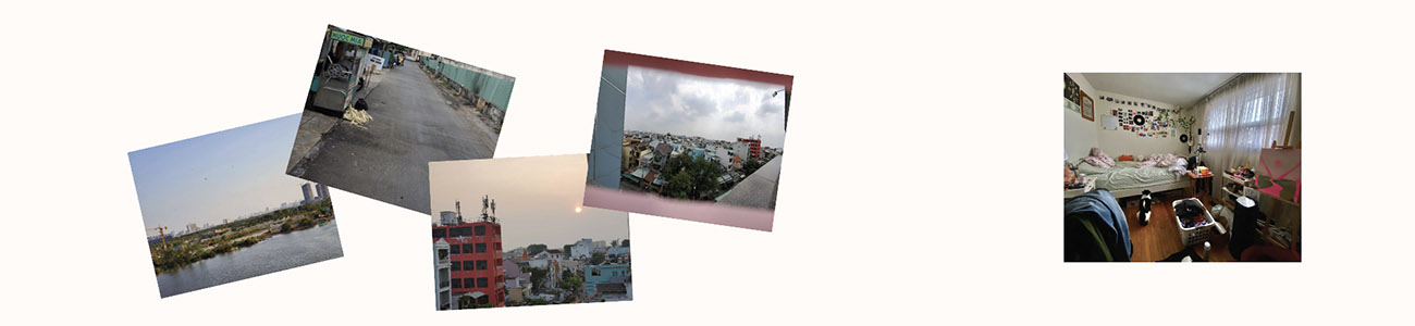 Next, I gathered photos he took of his surrounding areas in Vietnam, where Covid wasn't as prominent and he was able to be outside. In addition, a photo of my bedroom where I spend during quarantine. On the poster, I arranged them in a way that made them look glitchy to demonstrate the poor connection and lack of communication caused by the distance.